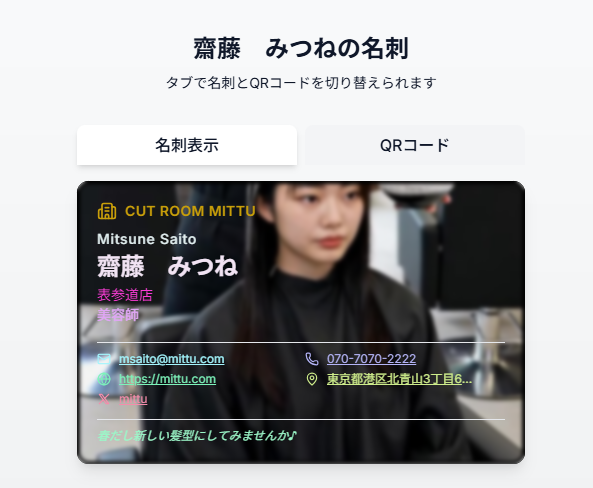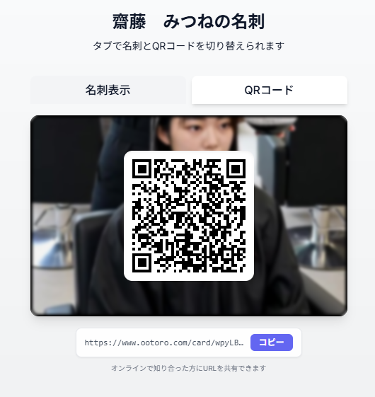 作ったオンライン名刺のQRコードを表示させて下に表示されるアドレスをコピー。