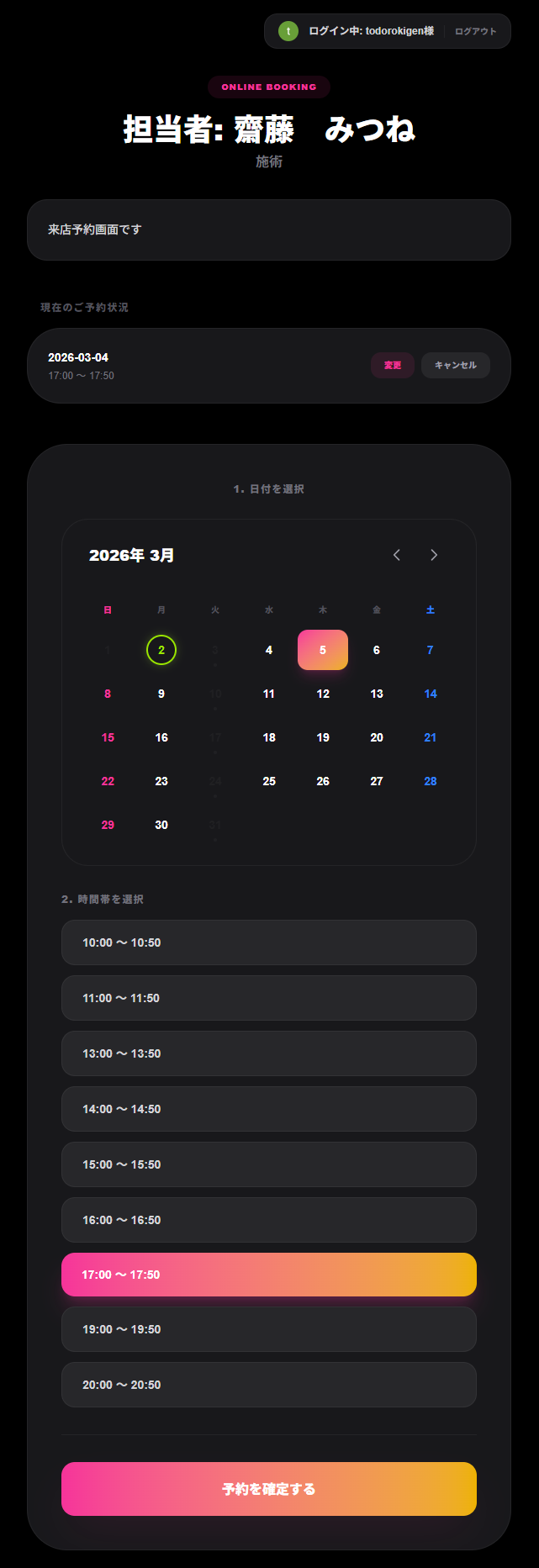 定休日と各施術サービスの時間単位を設定しておけば、お客さんは自分で好きな時にスマホで予約が入れられます。最近は電話が苦手な方も多いのでスマホの画面上で予約が入れられるのは非常に便利です。